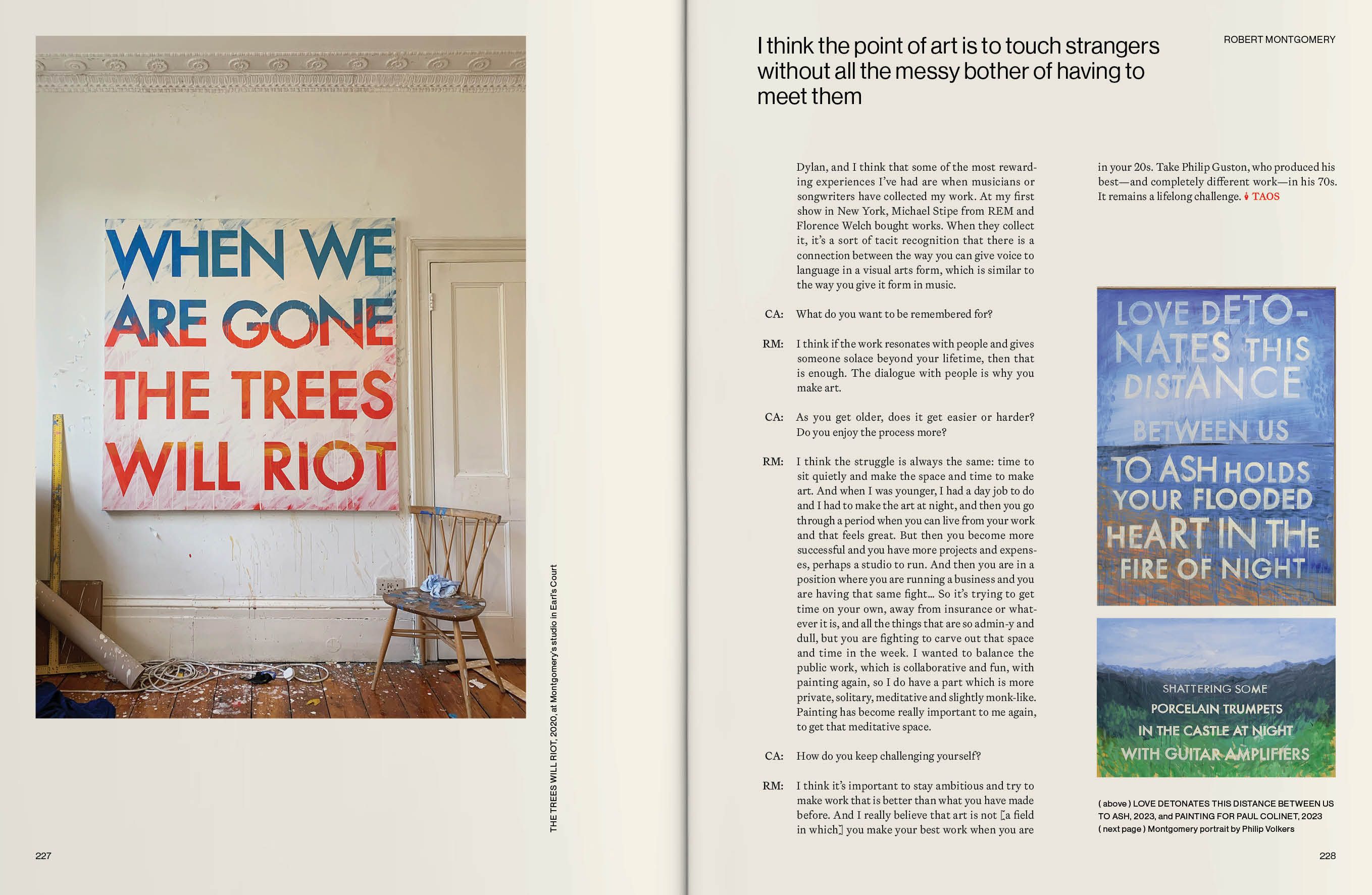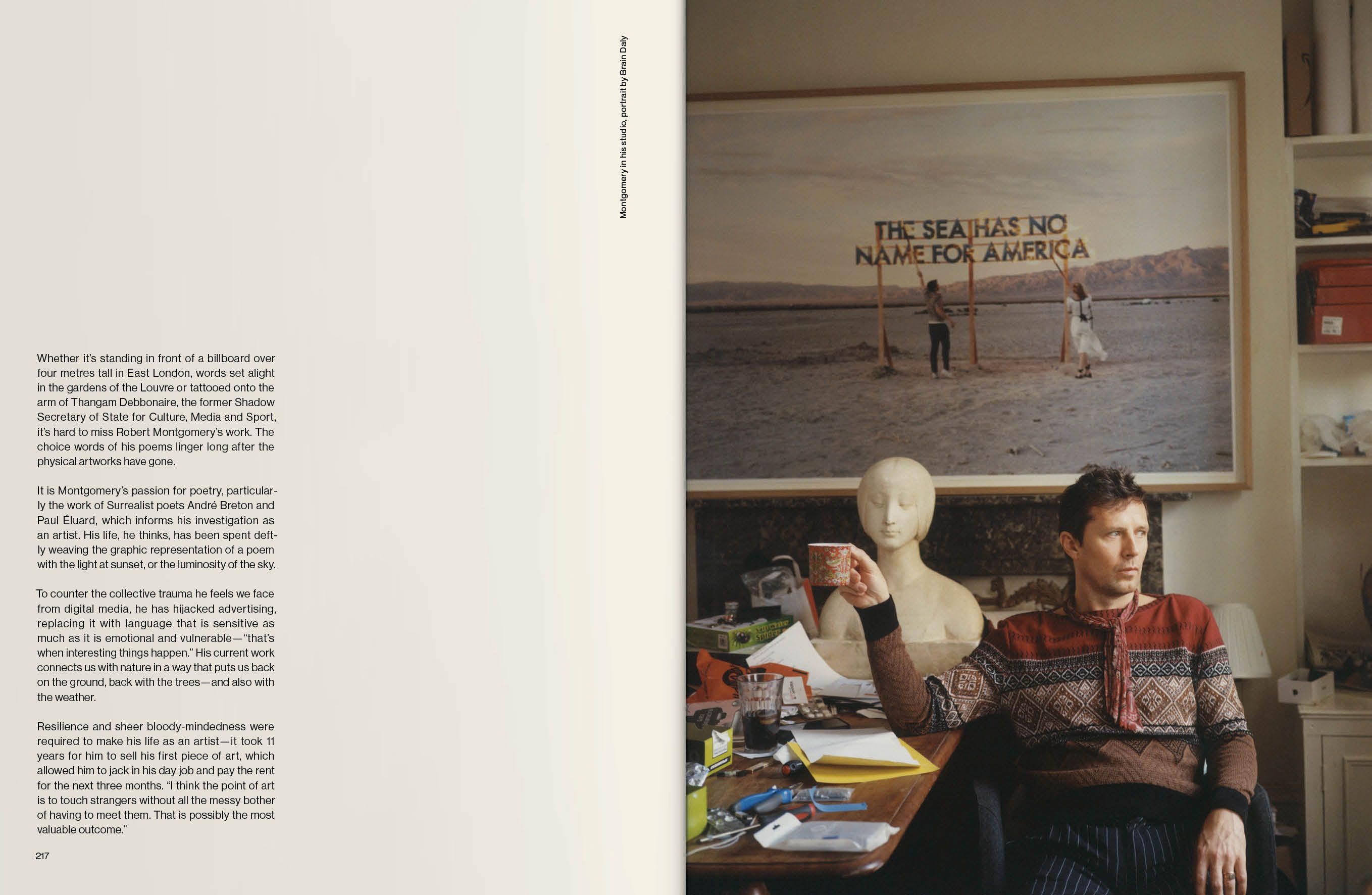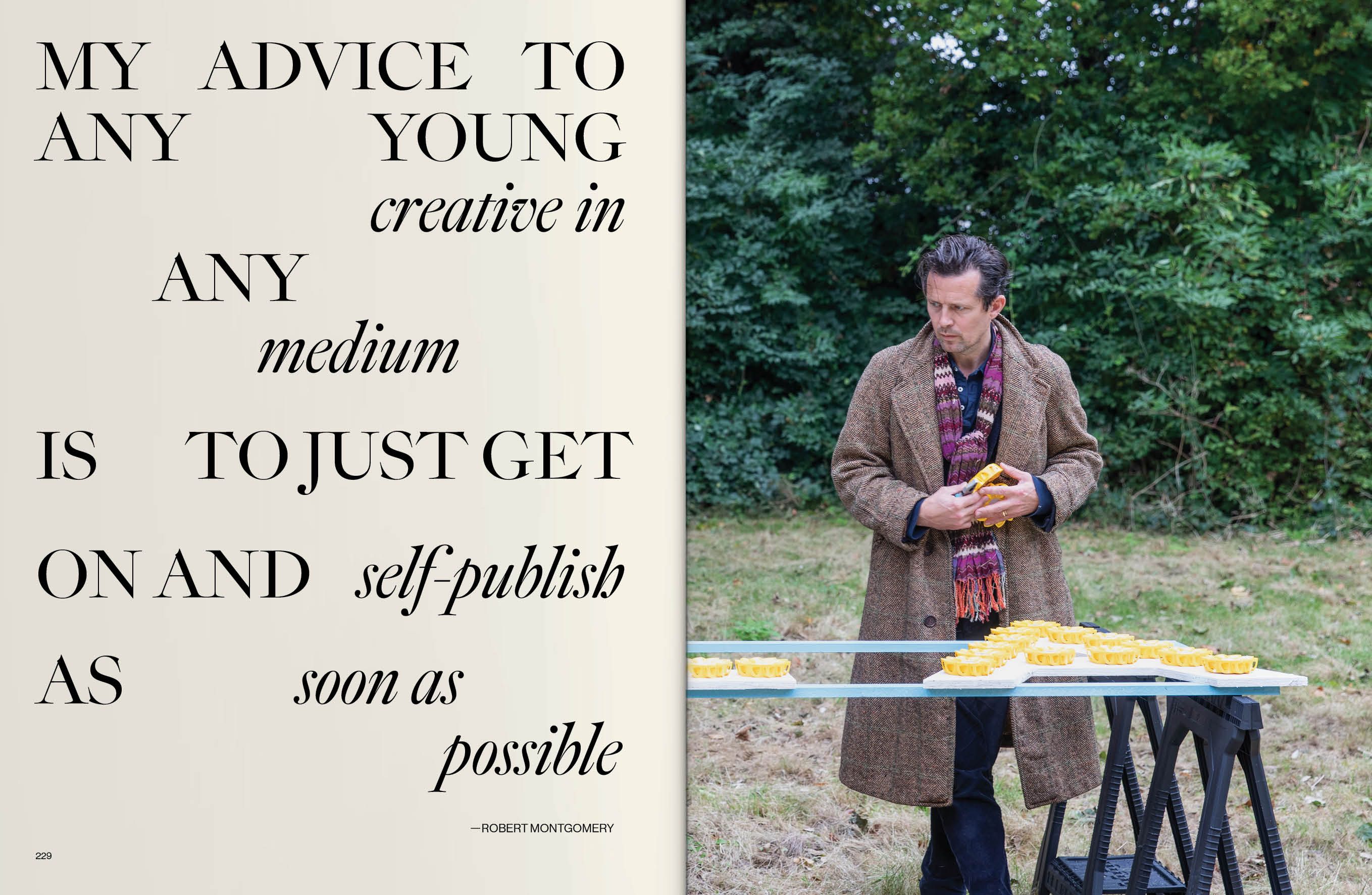 The people I have chosen to feature are all brave enough to share not just their work, but their whole journey: the highs and lows, the hardship and lessons learned, the rejection, the doubt, the moments they almost quit. They are people whom I admire for their talent, their knowledge, their discipline, their devotion and, most importantly, their endurance. Tom Broughton opens up about how broke he was before his Cubitts spectacle brand finally took off, chanson singer Vladimir Kornéev shares how he overcame war trauma and a stutter, and the artist and poet Robert Montgomery admits it took 11 years before he sold his first artwork. It is by overcoming such hardships that our artists are where they are today.